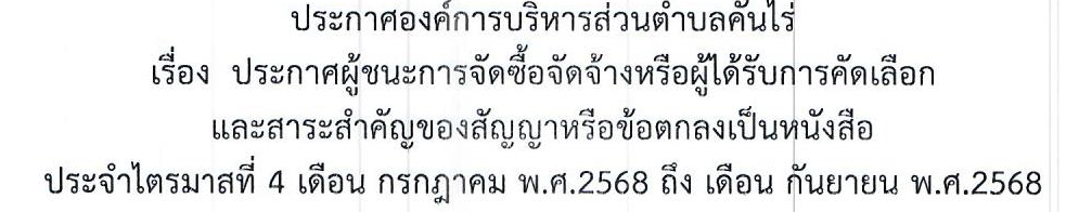 ประกาศองค์การบริหารส่วนตำบลคันไร่ เรื่อง ประกาศผู้ชนะการจัดซื้อจัดจ้างหรือผู้ได้รับการคัดเลือก ประจำไตรมาสที่ 4 เดือน กรกฎาคม ถึง กันยายน 2568